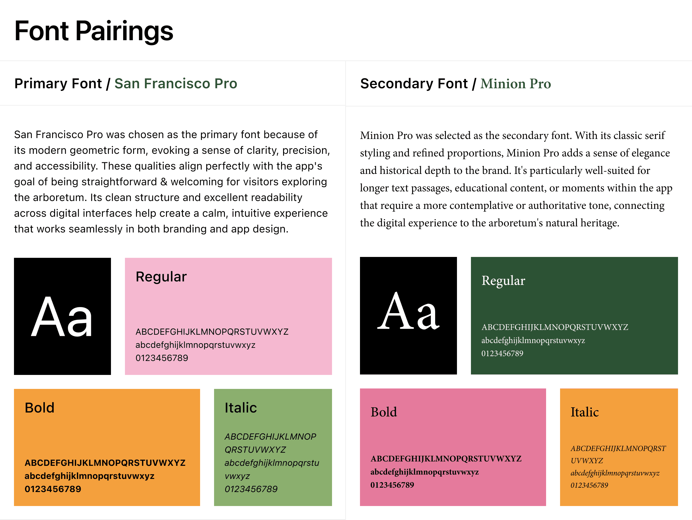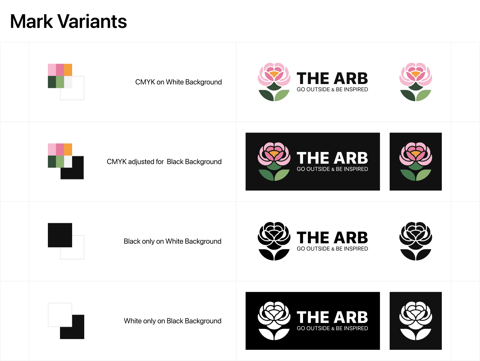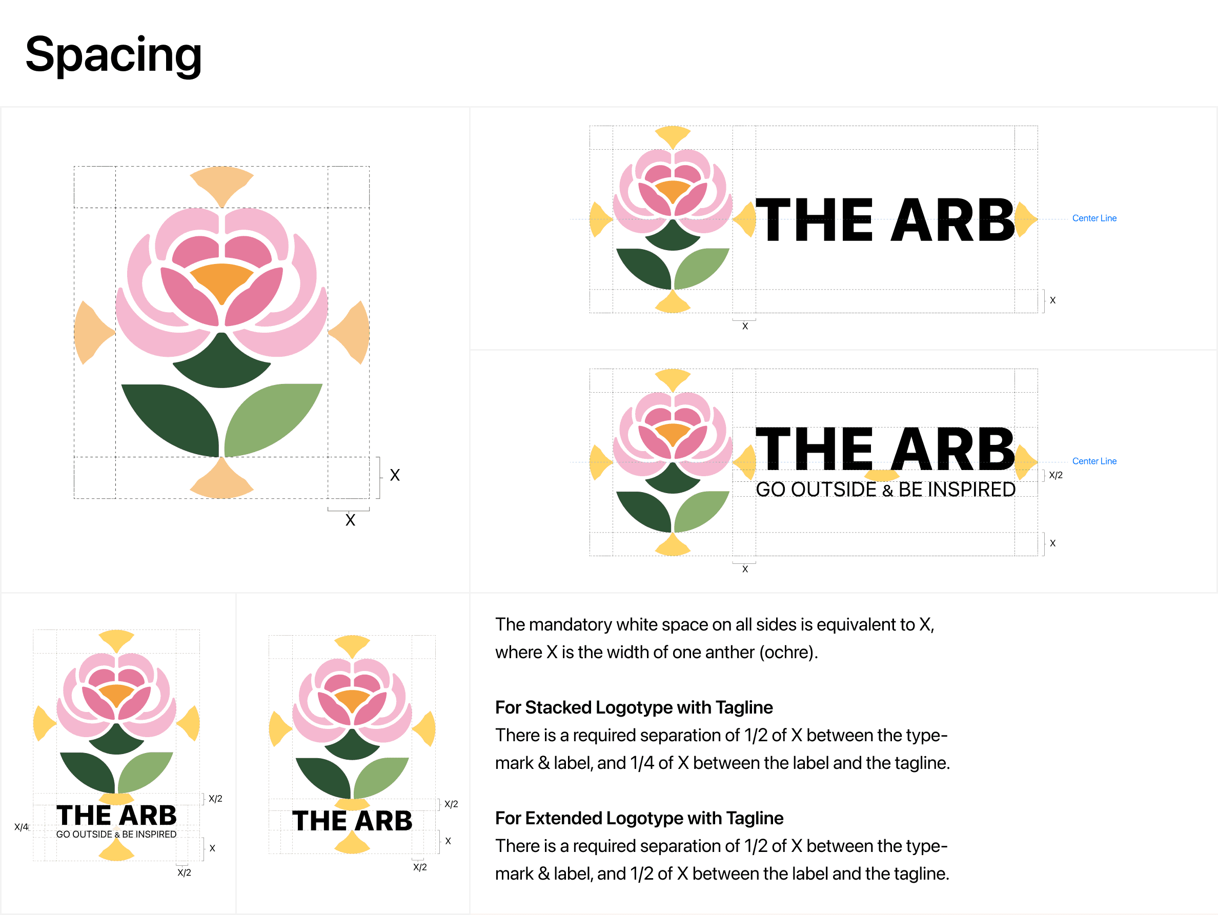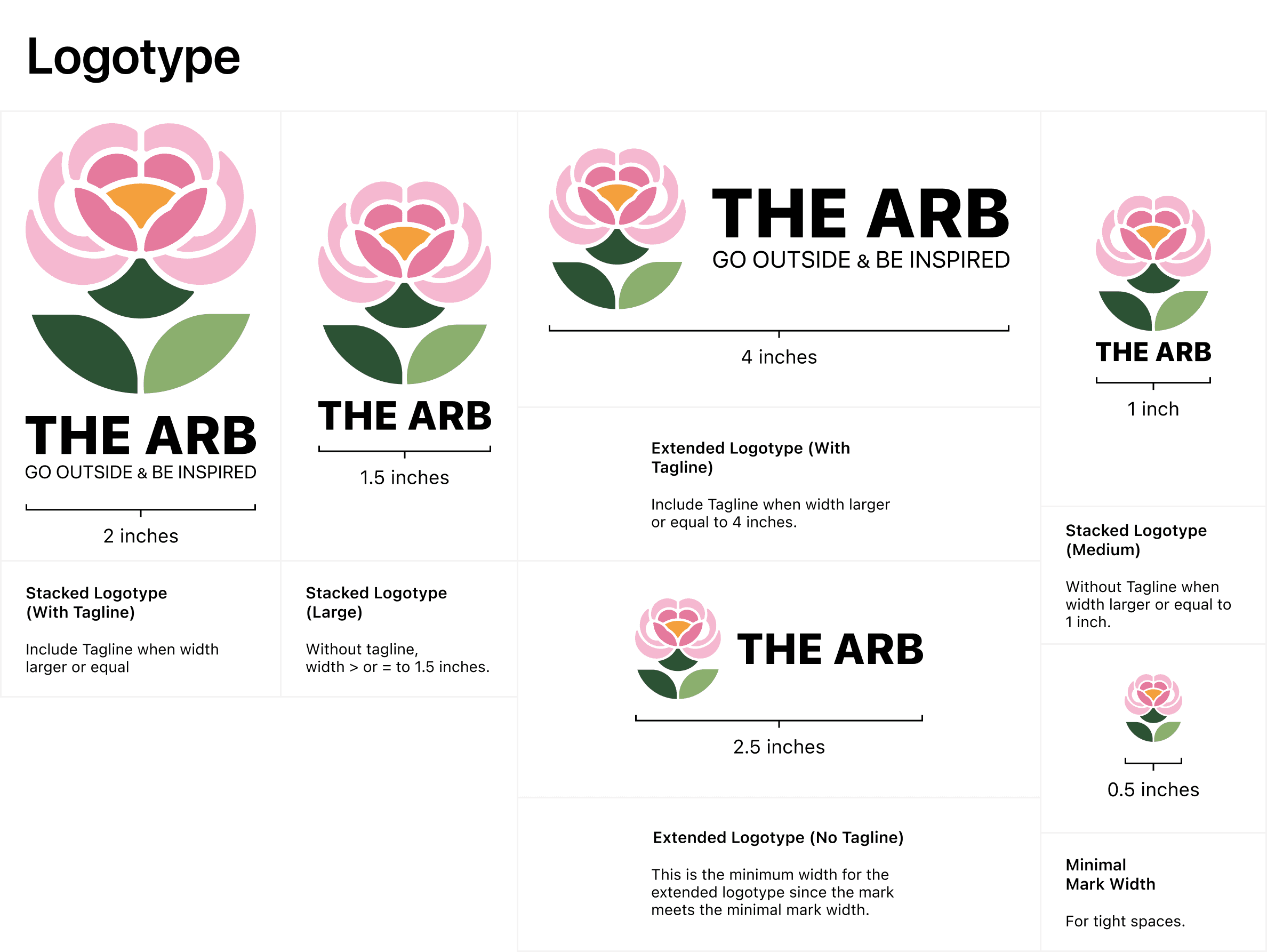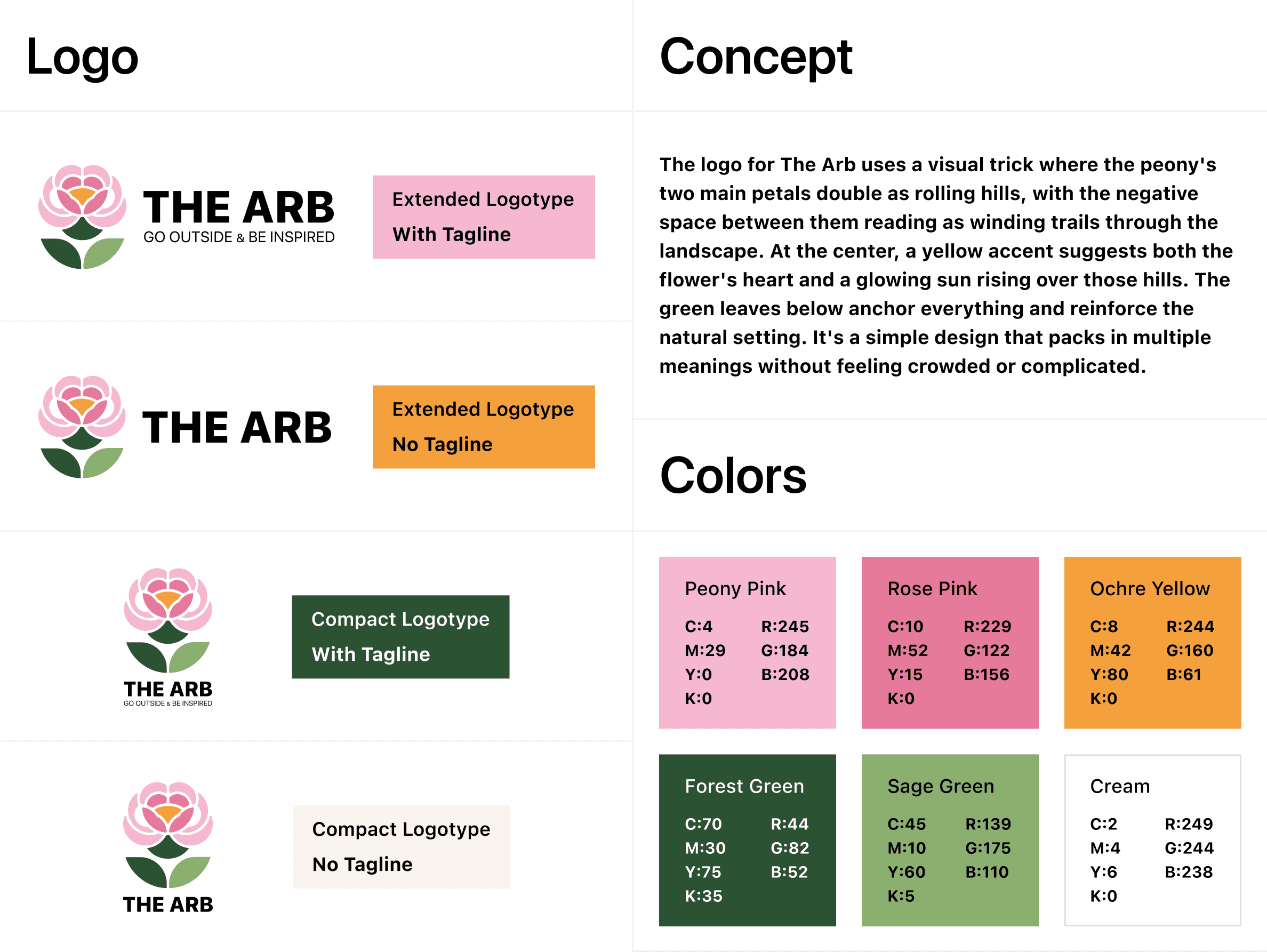 The Arb is a self-initiated brand identity for Nichols Arboretum, a well-loved green space in Ann Arbor without a cohesive visual identity. The logo centers on a peony, where the petals double as rolling hills and the negative space suggests winding trails, developed from pencil sketches into a geometry built on overlapping circles. From there I built out the full system: logotype variants with sizing and spacing rules, a color palette pulled from the actual landscape, a type pairing of San Francisco Pro and Minion Pro, mark variants for different backgrounds, candid photography direction, and collateral like a t-shirt mockup to test the mark at different scales.