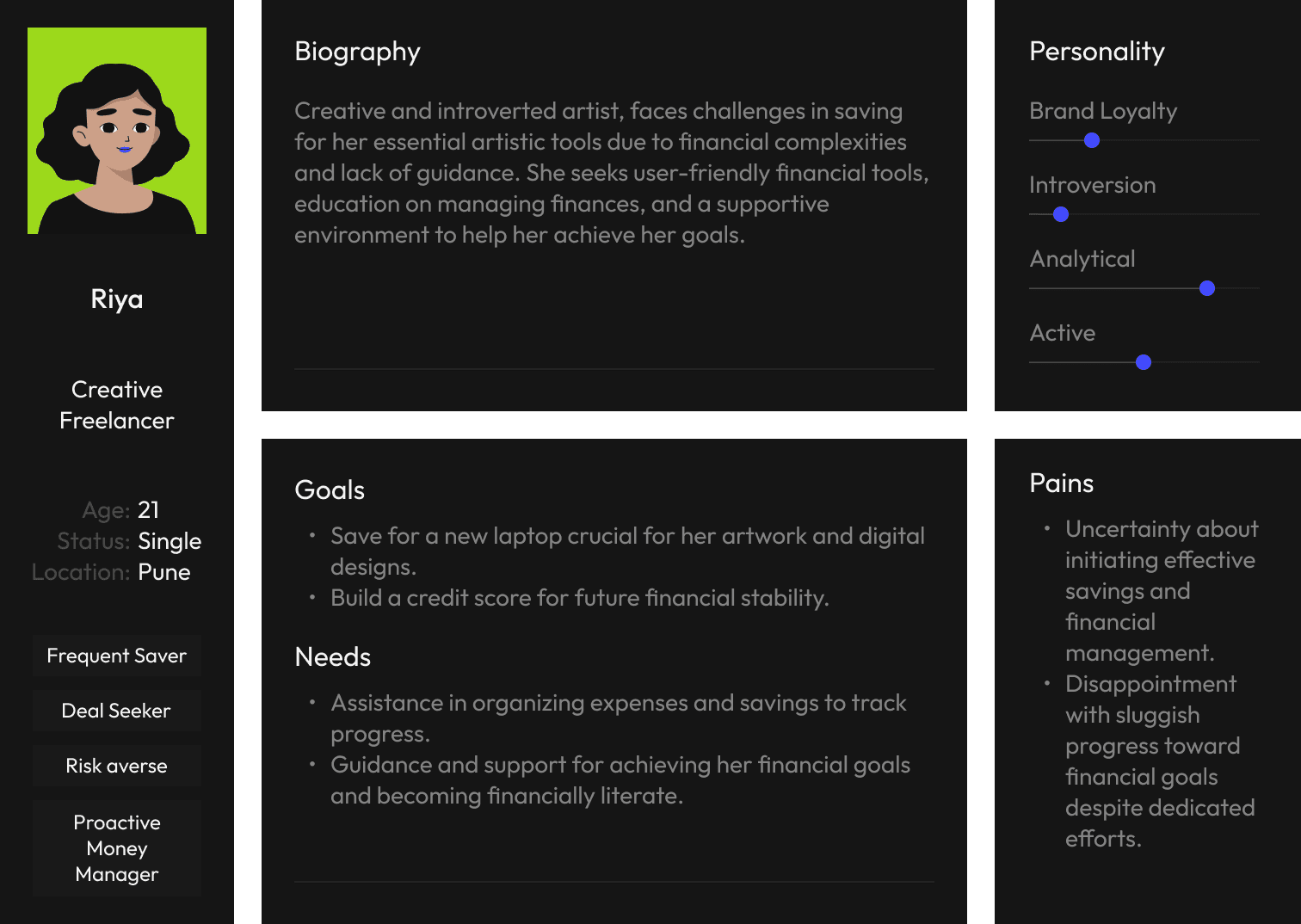 Users were overwhelmingly risk-averse, preferring stable investments. They were tech-savvy, mobile-first, and comfortable with digital platforms. Personalities ranged from adventure seekers to social trendsetters, but all wanted financial safety nets and conservative money decisions.