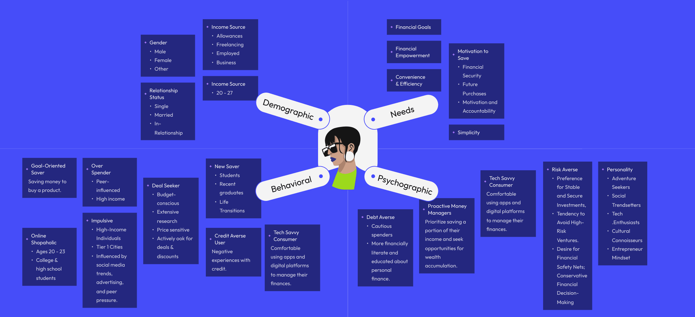 We identified distinct archetypes. Frequent savers (23+) saved regularly but lacked strategies. Goal-oriented savers were disciplined for specific purchases. Occasional savers (20-23) struggled with consistency. Spending patterns split into impulsive buyers, budget-conscious planners, over-spenders, and value seekers. Credit behavior divided into credit-averse users and credit-management users who understood but feared using credit.